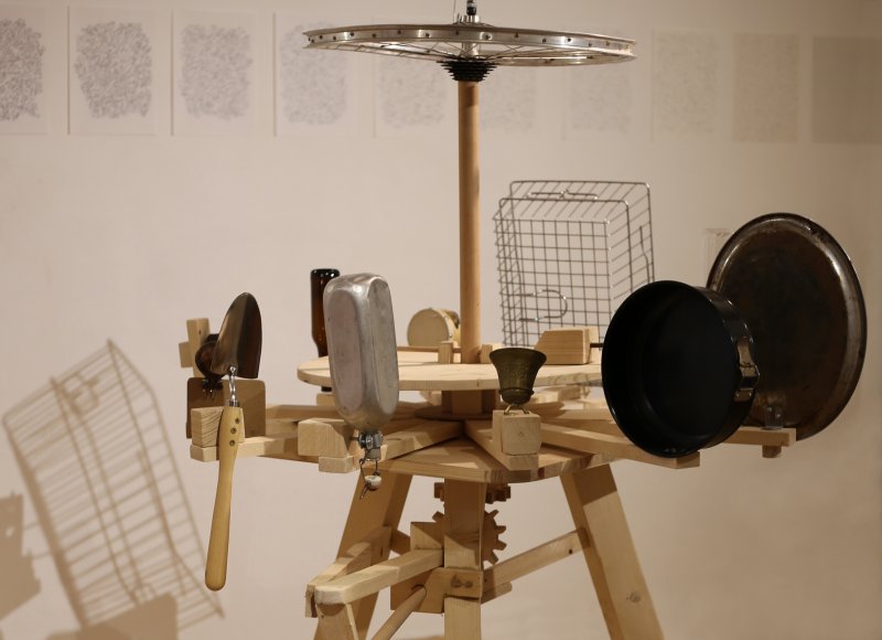 Zwölf Krachobjekte und eine Fahrradfelge mit Speichen an einer